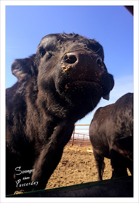 I had a run in with our youngest bull, not my first, but my closest so far. All turned out well, neither one of us is hurt, unless you count my look that could kill, but I do not get the impression he was disgruntled by that.