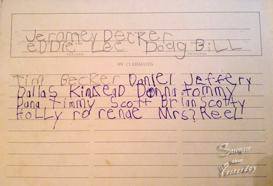 All make me smile, whether I remember a kind gesture from the Grob twins or little blond haired Scotty, slumber parties at Dana’s house, or the boys that were always getting into trouble like Jeramey, Jeffery and Dallas! I can’t forget the playground game of boys catch girls and vice versa.